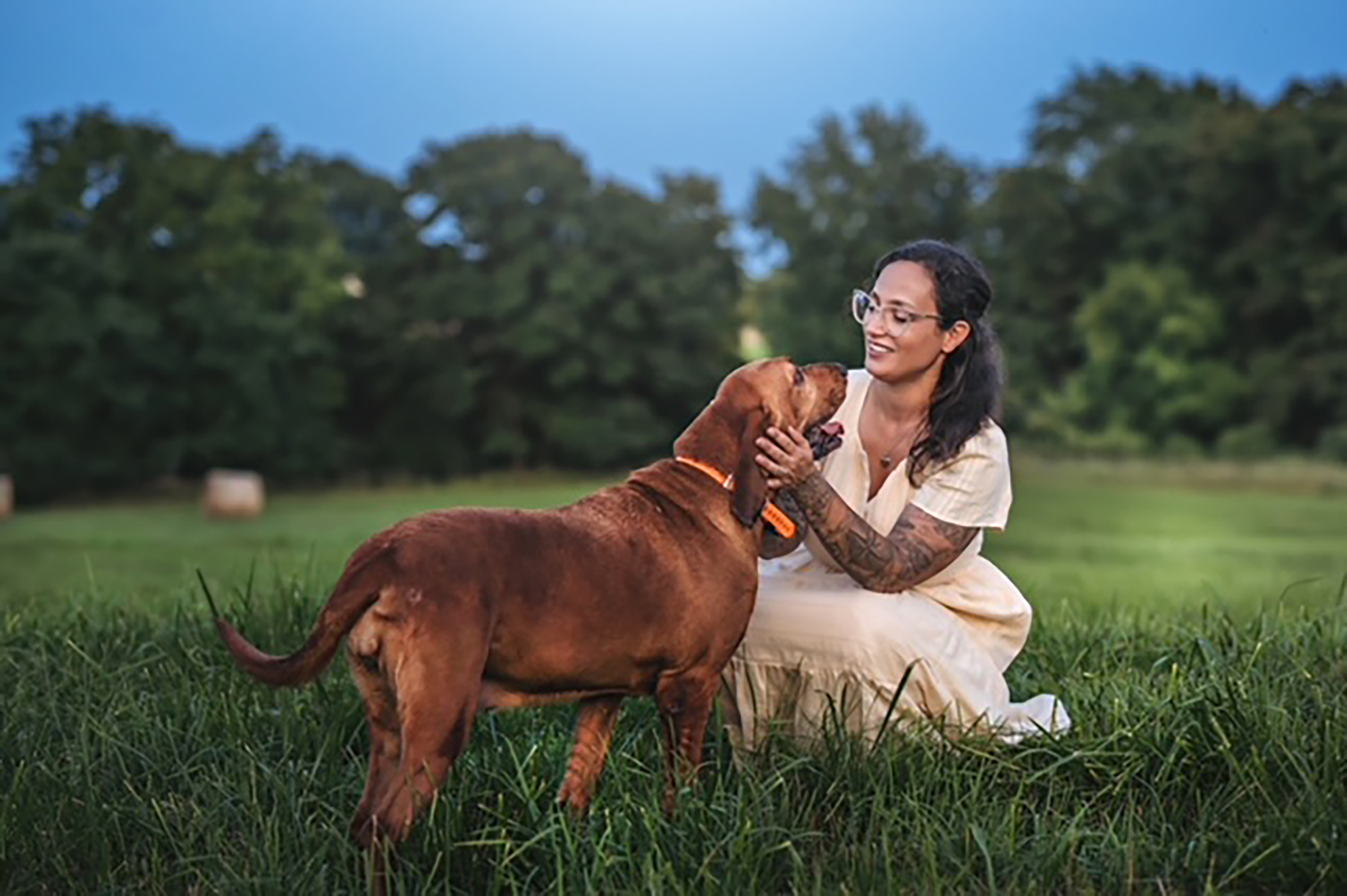 Ladybird and Jessica. Marine Corps veteran Jessica Johnson’s latest adventure is writing a series of children’s books. The first, Ladybird’s Bee Yard, tells the story of a lovable bloodhound who mysteriously grows flowers under her doghouse. Photo by Ashley Black of Red One Photography.