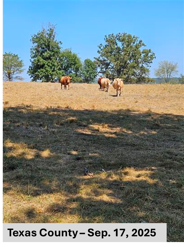 Texas County. Extreme drought in September 2025 left southwestern Missouri pastures in poor condition. Photo courtesy of the National Drought Mitigation Center’s Condition Monitoring Observer Reports program.