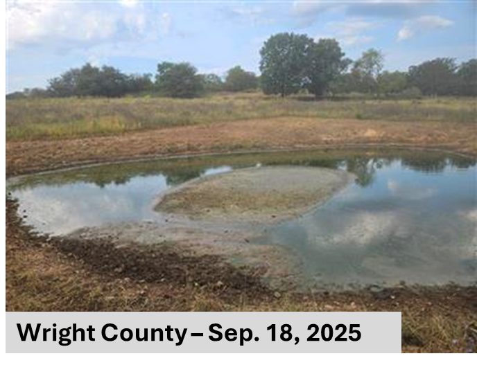 Wright County. Drought in in Wright County depleted ponds and other water sources for agriculture. MU Extension state climatologist Zachary Leasor said there were widespread reports of ponds with low or dry water levels. Photo courtesy of the National Drought Mitigation Center’s Condition Monitoring Observer Reports program.